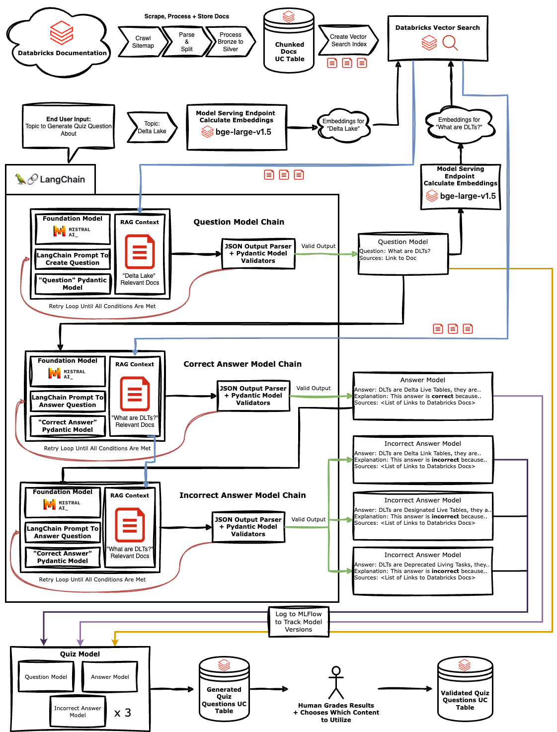 We'll first create a knowledge corpus by ingesting Databricks documentation and splitting it into chunks that we store in a vector search index. Then we'll use LangChain to define a set of "agents" that perform the steps of the quiz generation process. Finally, we'll explore how output parsers and retry logic can validate the quality and improve the reliability of the generated quizzes.